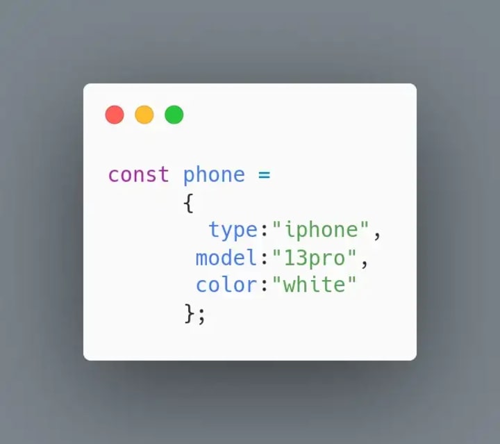 let phone = {type:”iphone”, model:”13pro”, color:"white"};