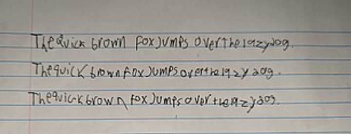 Three handwritten repetitions of the phrase "The quick brown fox jumps over the lazy dog" on lined paper. The writing, by an adult with dysgraphia, exhibits variations in letter formation, inconsistent spacing, and irregular alignment, all key characteristics of the condition.