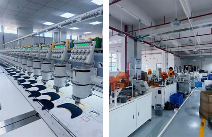 What’s even more impressive is the automation in some smart production lines. About 60% of the cap-making process is automated, including eyelet stitching, panel shaping, brim sewing, and single or dual-needle stitching. Vision systems precisely position the fabric, robotic arms handle the panels, and precision sewing machines complete the stitching. One full set of operations takes about 8 seconds.