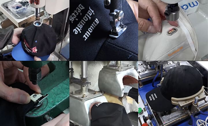 A standard baseball cap goes through multiple production steps, including pattern making, cutting the panels, stitching the crown together, attaching the sweatband, shaping the brim, adding embroidery or prints, final assembly, and steam finishing.