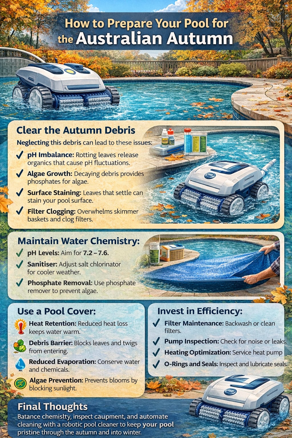 As the Australian autumn sets in, your pool faces a new set of challenges—falling leaves, cooler temperatures, and shifting water chemistry. Preparing early helps you maintain crystal-clear water, protect your equipment, and reduce maintenance effort heading into winter.