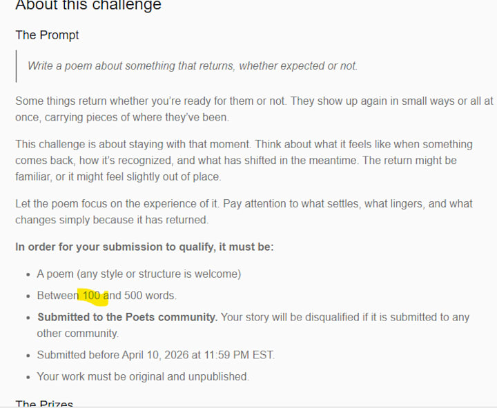 Poets has been the only community I can post less than 600 words. Did something change and I was left behind? But I do agree, poetry challenges should be limited at a MAX of 100-200.